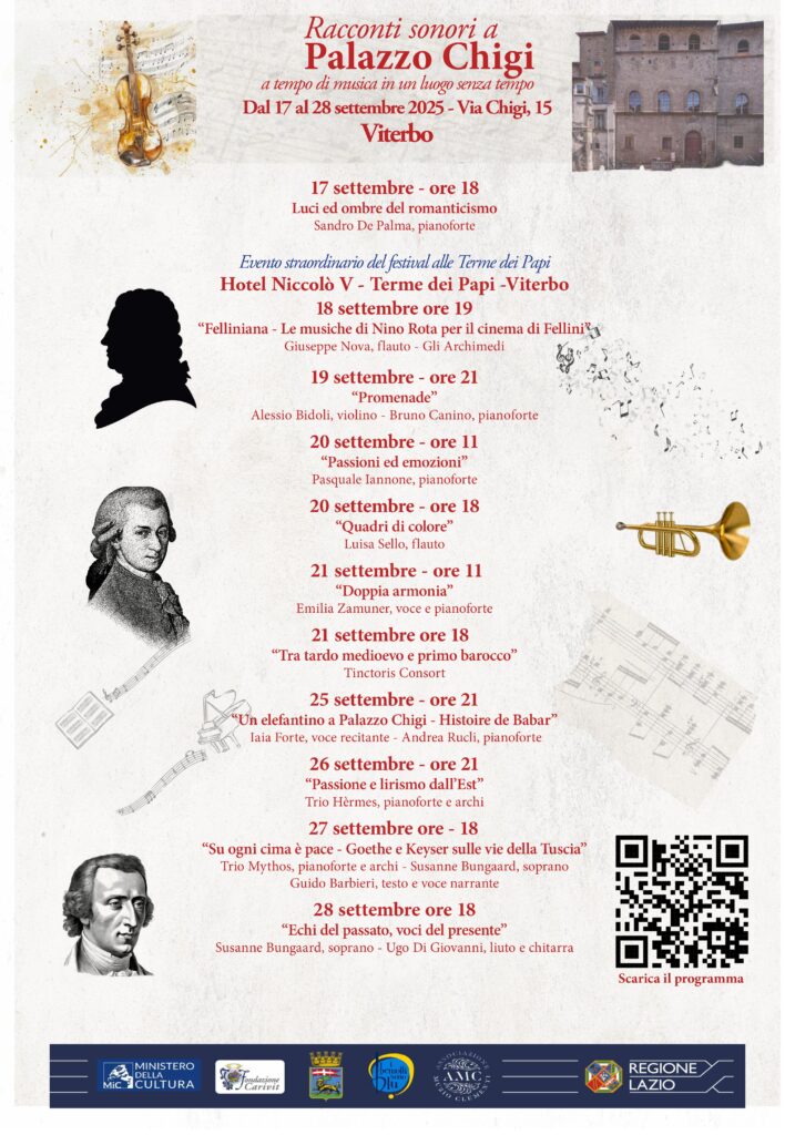 Il direttore artistico Sandro De Palma sottolinea che “dopo i grandi successi di pubblico ottenuti nell’edizione di primavera a Palazzo Chigi, la nuova rassegna autunnale del Festival di Viterbo porta in uno specifico percorso condiviso e diffuso numerosi solisti di altissimo livello internazionale e interpreti delle più belle pagine di musica che spaziano dal Settecento ai giorni nostri”.