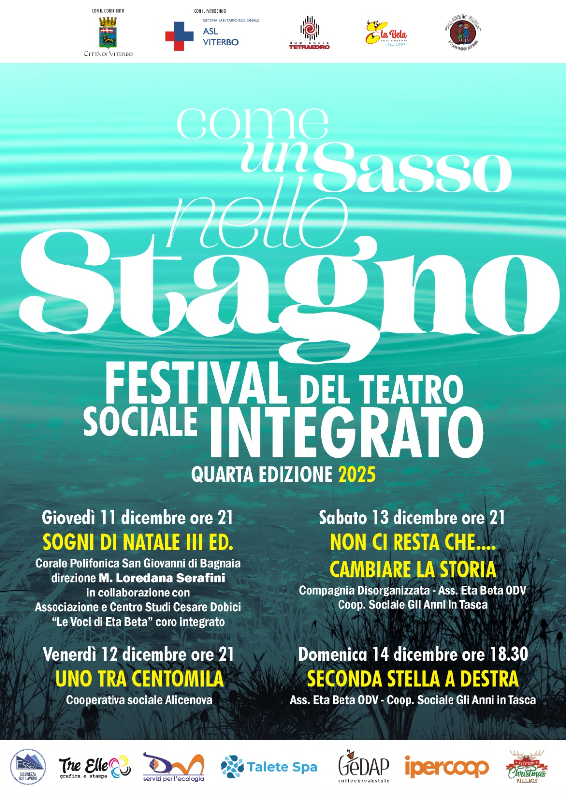 Martedì 2 dicembre alle ore 10,30, al Teatro dell’Unione, verrà illustrato il programma della quarta edizione del Festival di Teatro integrato Come un sasso nello stagno, in programma dall’11 al 14 dicembre.